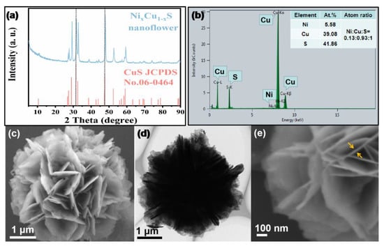(a) The XRD pattern, (b) EDS spectrum (the inset shows the atomic percentage), (c) low-magnification SEM image, (d) low-magnification TEM image and (e) high-magnification SEM image of Ni0.1Cu0.9S nanoflower.