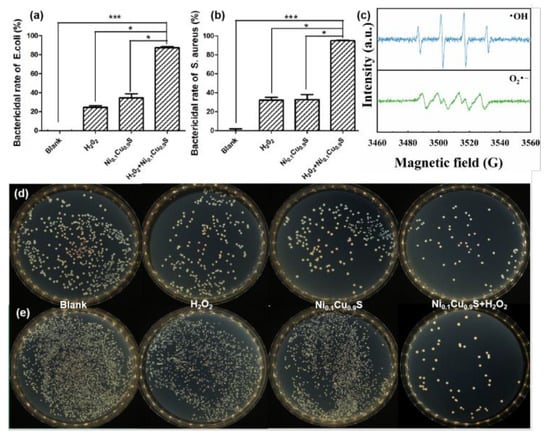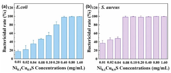 Afterwards, the antibacterial effectiveness was also tested by the relationship between the number of E. coli and S. aureus colonies and the concentration of the Ni0.1Cu0.9S nanozyme when about 108 CFU of bacteria are applied to the LB plates. Then, we further tested the MIC, which is defined as the lowest concentration of antibacterial agents in solution that completely prevents the growth of bacteria in standard incubation conditions. Clearly, the antibacterial rates of the Ni0.1Cu0.9S nanozyme towards the two bacteria show a strong dependence on the concentration. As expected, with other conditions being equal, the antibacterial rate raises with the increase in Ni0.1Cu0.9S concentration (in Figure 7). More importantly, when the concentration of the Ni0.1Cu0.9S nanozyme reaches 0.4 mg/mL, the antibacterial rate toward E. coli is almost 100% and remains fixed when continuing to add more antibacterial materials. As for the antibacterial rates toward S. aureus, the Ni0.1Cu0.9S nanozyme exhibits a maximum killing efficacy almost of 98.2% at the concentration of 0.08 mg/mL. Compared with the blank group, no sight of bacteria on the dishes is found when treated with the Ni0.1Cu0.9S nanozyme in the presence of H2O2 (0.1 mM). The observation suggests that the Ni0.1Cu0.9S nanoflower possesses an excellent broad-spectrum antibacterial property, as well as dose-dependent antibacterial efficacy, which has potential applications in the biomedical field.