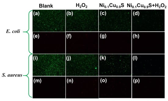 Live-dead fluorescence images of (a–h) E. coli and (i–p) S. aureus colonies, where viable cells were stained green with SYTO 9 and dead cells were stained red with propidium iodide. ((a,e,i,m): blank; (b,f,j,n): H2O2-only; (c,g,k,o): Ni0.1Cu0.9S-only; (d,h,l,p): Ni0.1Cu0.9S + H2O2).