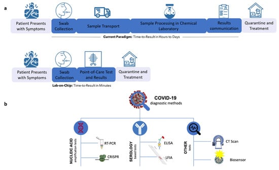 The most widely used method to detect SARS-CoV-2 virus infection nowadays is the reverse transcription polymerase chain reaction (RT-PCR) test. However, other methods, such as computerized tomography (CT) imaging and whole genome sequencing have been used to diagnose infected individuals [2]. In addition, the enzyme-linked immunosorbent assay (ELISA) and lateral flow immunoassay (LFIA) are also viable methods for COVID-19 diagnosis. However, the major drawbacks associated with these diagnosis methods are that they are time-intensive and require trained technicians and the use of expensive laboratory equipment. This necessitates the development of point-of-care biosensors for rapid testing and the quicker identification of infected patients [3]. Biosensors make use of the physiochemical detection of chemical substances containing a biological component. The use of point-of-care biosensors can decrease the time taken for an analysis to a few minutes instead of the several hours required in conventional methods, allowing patients to receive healthcare sooner and contain the spread of the virus [4]. Figure 1a provides an overview of the effectiveness of point-of-care tests in delivering more timely results [4]. The top diagram depicts the current paradigm in which detection duration varies from hours to days. The bottom diagram shows rapid detection using lab-on-chip technology, with results available in minutes. There have been recent studies on the detection of COVID-19 using point-of-care devices or lab-on-chip platforms; however, this is still an emerging research area with great potential for the future in the areas of disease monitoring and diagnosis. Figure 1b depicts the various methods available for detecting SARS-CoV-2 virus [5]. It includes nucleic acid amplification tests (such as RT-PCR and clustered regularly interspaced short palindromic repeats (CRISPR)), serology-based tests (such as ELISA, LFIA), and others (such as CT scan, biosensors) [5].