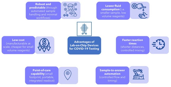 Schematic diagram depicts the advantages of lab-on-chip devices for COVID-19 testing. Reprinted with permission from Springer Nature [4], Copyright (2020).