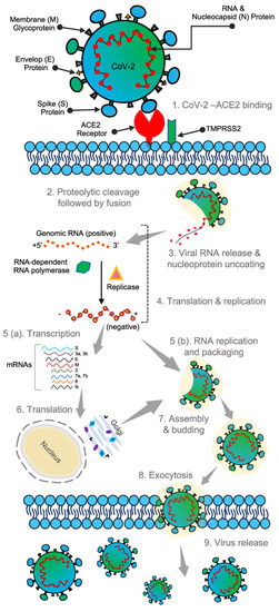 - Jain, J.; Gaur, S.; Chaudhary, Y.; Kaul, R. The molecular biology of intracellular events during Coronavirus infection cycle. Virusdisease 2020, 31, 75–79. [Google Scholar] [CrossRef]