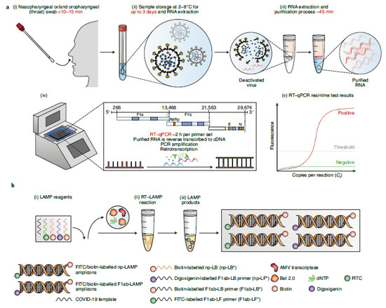 The SARS-CoV-2 virus consists of a single-stranded RNA that possesses a good genetic similarity to other members of the coronavirus family [29]. The main technique used for detection is RT-PCR, which amplifies the genetic material of the SARS-CoV-2 virus for testing. Genes targeted during RT-PCR include the spike protein, nucleocapsid, envelope genes, and RNA-dependent RNA polymerase [30]. There are two methods to isolate nucleic acids: the first is the lengthy extraction procedure, and the second is through direct capture from the sample [31]. Figure 5 represents the different types of RNA detection methods [32]. These include RT-PCR testing (Figure 5a) and SARS-CoV-2 RT-loop-mediated isothermal amplification (LAMP) testing (Figure 5b). The different steps involved in SARS-CoV-2 are clear from the schematic diagram.