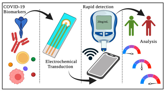 Biosensors enable the rapid processing of samples that contain biological targets of interest for environmental monitoring and diagnosing disease [35]. In addition, biosensors are essential for the early identification of infections because of the urgency with which information must be obtained to stop the spread of the virus. With recent advancements in nanoscience and nanotechnology, biosensors offering the advantages of higher sensitivity, ease of use, and shorter time for analysis can be developed [36,37,38]. For example, using biosensors for SARS-CoV-2 virus detection helped to increase access to testing, and the testing became more efficient. This helps in the containment of the SARS-CoV-2 virus. The two types of rapid point-of-care tests include (a) nucleic acid tests and (b) antibody tests, which are commonly used to detect SARS-CoV-2 virus infection [39]. A schematic diagram of a point-of-care test is shown in Figure 8.