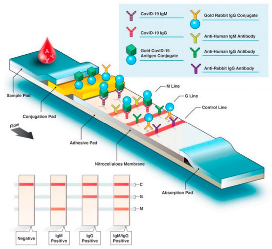 The most commonly used immune-based tests contain COVID-19-specific recombinant antigens that are initially immobilized on membranes made of nitrocellulose. Antibodies such as IgM and IgG are conjugated with colored latex beads and further immobilized onto different conjugate pads. The test sample initially encounters the nitrocellulose membrane, and the human antiviral antibodies will make conjugate complexes with colored antibodies. The COVID-19-specific recombinant antigens capture this immobilized complex. If the specific IgG/IgM antibodies related to COVID-19 are present in the test sample, a colored band appears, eventually confirming the infection, and the absence of it indicates a negative result (Figure 6) [32].