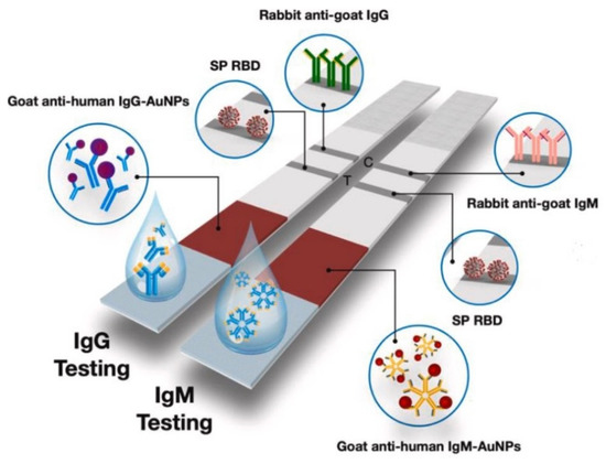 The presence and level of two antibodies IgG and IgM, specific to SARS-CoV-2, have been exploited as a test component by Li et al. [47]. Upon viral infection, the level of IgM rapidly increases and decreases eventually, whereas IgG production starts later, but the level remains constant even after recovery. Wen et al. have reported a point-of-care assay for IgG antibody detection, specifically against SARS-CoV-2 [48]. Cavalera et al. have introduced another multi-target immunoassay comprising two test lines for IgG and IgM [49]. Similarly, in late 2020, Wang et al. developed a dual-mode LFIA using quantum dot nanobeads that could detect IgG and IgM antibodies specific to SARS-CoV-2 [50]. The sample volume required was as low as 1 uL, and the process returned results in only 15 min.