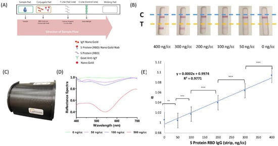 The COVID-19 pandemic has produced a massive influence and impact on the economic and daily life of people, societies, and countries worldwide. As of January 2022, over 300 million people have become infected and five million people have succumbed to the disease []. The development of vaccines and wide promotion of vaccination can effectively produce and upregulate virus antibody in the human body to generate protection against SARS-CoV-2, which is especially impactful for physically at-risk individuals and those with vulnerable cohorts, such as healthcare workers and pregnant women [,,]. However, the potentially endless emergence of variant types of SARS-CoV-2, such as Alpha (B.1.1.7), Beta (B.1.351), Gamma (P.1), Delta (B.1.617.2), and Omicron (B.1.1.529) variants, reduces vaccine efficacy, and numerous breakthrough SARS-CoV-2 infections after vaccination have been reported. Vaccine protection evaluation can be determined by analyzing neutralizing antibodies (Nabs) concentration or inhibition rates to virus protein []. The antibody for the spike protein receptor binding domain (SRBD IgG) to SARS-CoV-2 is a well-established marker that can be used to assess Nab detection [,]. From the literature, the antibody tests (IgG/IgM) showed low sensitivity (less than 30.1%) in the first week of the onset of symptoms, but increased up to 72.2%, 91.4%, and 96% during the second week, third week, and fourth-to-fifth weeks, respectively []. Additionally, the overall sensitivity was around 70 to 80% by chemiluminescence immunoassay and ELISA with IgG or IgM. The lateral flow immunoassay showed sensitivity as 78%, 47%, and 82% with IgG, IgM, and IgM/IgG [], respectively. In our previous research, the use of a lateral flow immunoassay in combination with a spectrum analyzer has been shown to effectively detect IgG in serum [].