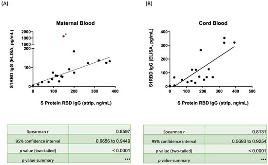 (A) Scatter plot showing the correlation between SRBD IgG by the lateral flow immunoassay/spectrum analyzer and ELISA for maternal serum. (B) Scatter plot showing the correlation between SRBD IgG by the lateral flow immunoassay/spectrum analyzer and ELISA in neonatal cord blood. The red spot (a) in Table S3 was case 17 and was censored in the correlation line due to it being an outlier. SRBD, spike protein receptor binding domain; ELISA, enzyme-linked immunosorbent assay. *** p < 0.001.