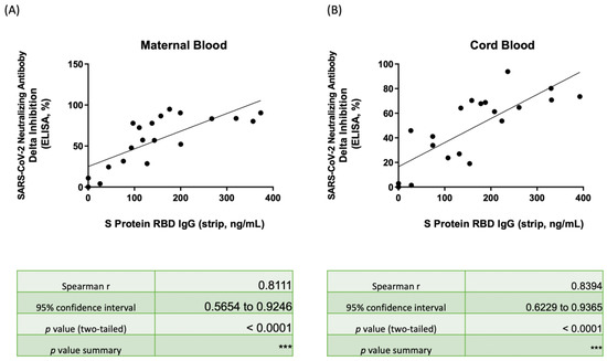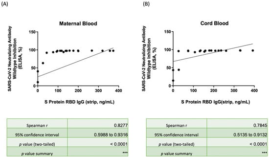 (A) Scatter plot showing the correlation between SRBD IgG by the lateral flow immunoassay/spectrum analyzer and the neutralizing antibody inhibition rates against wild-type SARS-CoV-2 by ELISA in maternal serum. (B) Scatter plot showing the correlation between SRBD IgG by the lateral flow immunoassay/spectrum analyzer and the neutralizing antibody inhibition rates against wild-type SARS-CoV-2 by ELISA in neonatal cord blood. SRBD, spike protein receptor binding domain; ELISA, enzyme-linked immunosorbent assay. *** p < 0.001.