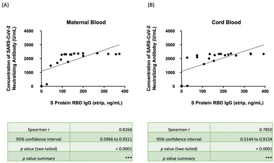 (A) Scatter plot showing the correlation between SRBD IgG by the lateral flow immunoassay/spectrum analyzer and the neutralizing antibody concentration against wild-type SARS-CoV-2 by ELISA in maternal serum. (B) Scatter plot showing the correlation between SRBD IgG by the lateral flow immunoassay/spectrum analyzer and the neutralizing antibody concentration against wild-type SARS-CoV-2 by ELISA in neonatal cord blood. SRBD, spike protein receptor binding domain; ELISA, enzyme-linked immunosorbent assay. *** p < 0.001.