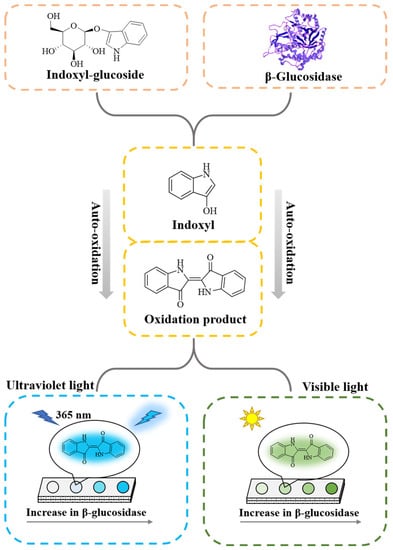 Schematic illustration of fluorescent and colorimetric dual-mode detection of β-glucosidase, based on the paper-based device using indoxyl-glucoside as a substrate.