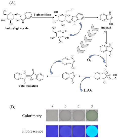 (A) Reaction mechanism of indoxyl-glucoside in the presence of β-glucosidase. (B) Fluorescent and colorimetric diagrams of paper-based device in the presence of different reagents: (a) pure filter paper, (b) indoxyl-glucoside, (c) β-glucosidase, (d) indoxyl-glucoside and β-glucosidase.