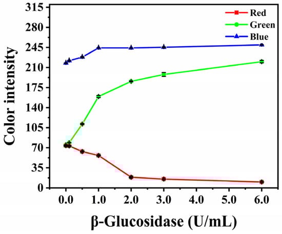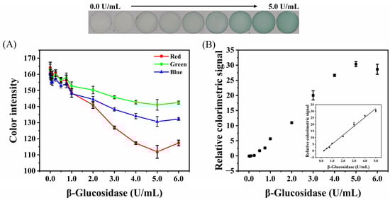 The colorimetric method was also used to detect the activity of β-glucosidase. The RGB channel value of the obtained image is shown in Figure 7A. The values of the RGB channels decreased with the increase in β-glucosidase activity, and the change of the red channel was the most sensitive, followed by the blue and green channels. Therefore, the value obtained through subtracting the red channel from the green channel was selected as the colorimetric signal. The RGB channel values were processed by Equations (1) and (2) to obtain the relationship between the relative colorimetric signal and the activity of β-glucosidase (Figure 7B). With the increase in β-glucosidase activity, the detection area changed from white to green, and the relative colorimetric signal increased. The relative colorimetric signal and the activity of β-glucosidase presented excellent linear dependence, in the range of 0.25−5.00 U/mL. The regression equation is Y = 5.7351 × C[β-glucosidase] − 1.5741 (R2 = 0.9942), and the LOD is 0.0668 U/mL.