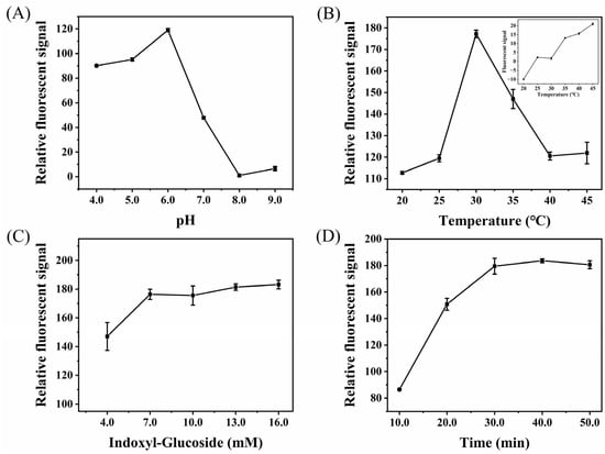 Effect of pH (A), temperature (B), indoxyl-glucoside concentration (C), and reaction time (D) on the fluorescent detection of β-glucosidase by the paper-based device, β-glucosidase = 1.0 U/mL. Inset: effect of temperature on the fluorescent detection of β-glucosidase by the paper-based device, β-glucosidase = 0.0 U/mL.