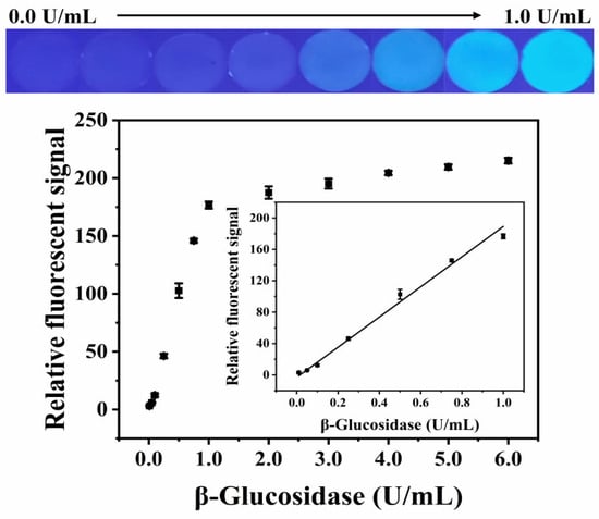 Figure 6 shows the relative fluorescent signal of the paper-based device versus the activity of β-glucosidase, in the range of 0.00–1.00 U/mL. It can be seen from the graphics that, with the increase in β-glucosidase activity, the detection area gradually emitted bright blue-green fluorescence, accompanied by an increase in the relative fluorescent signal. The relative fluorescent signal showed a good linear relationship with the β-glucosidase activity, in the range of 0.01–1.00 U/mL (Y = 192.1756 × C[β-glucosidase] − 3.0873, R2 = 0.9924), and the LOD was 0.005 U/mL (LOD = 3 σ/S, where σ represents the standard deviation of 11 blank sample measurements, and S is the slope of the corresponding calibration plot).
