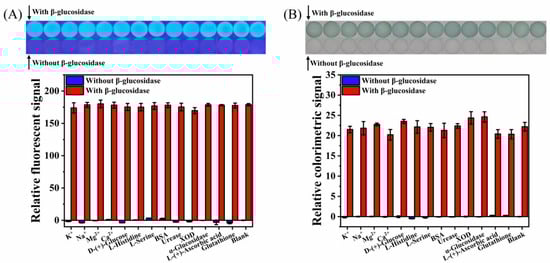 Selectivity and interference study of the paper-based device for β-glucosidase detection: (A) fluorescence, (B) colorimetry.