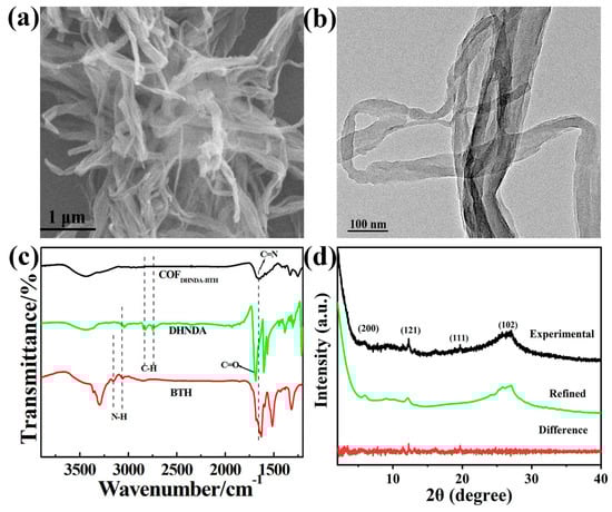 (a) SEM image of COFDHNDA-BTH. (b) TEM image of COFDHNDA-BTH. (c) FTIR spectra of DHNDA, BTH, and COFDHNDA-BTH. (d) Experimental and refined XRD pattern as well as the difference.