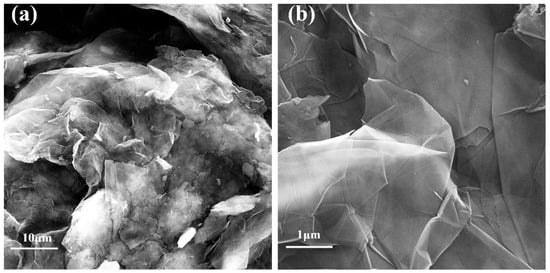 Figure 2a,b show the morphology and structure of commercial carbon paper with high and low magnification, respectively. The figures reveal a rough surface with graphene-like foam, which was more conducive to loading active materials and to transferring electrons and electrolyte ions.