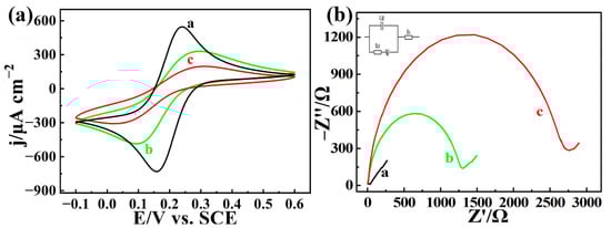 (a) CVs and (b) EIS of GCE (curve a), COFDHNDA-BTH/GCE (curve b), and AChE/COFDHNDA-BTH/GCE (curve c) in 0.1 M KCl with 5.0 mM [Fe(CN)6]3−/4−.