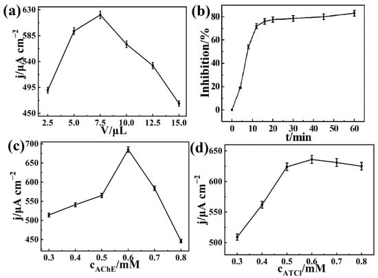 Firstly, the loading amount of COFDHNDA-BTH on the AChE/COFDHNDA-BTH/GCE was optimized by dropping different volumes of 2 mg/mL COFDHNDA-BTH onto the GCE. As shown in Figure 4a, with the amount of COFDHNDA-BTH dropped onto the COFDHNDA-BTH increased, its peak current also increased, because the more COFDHNDA-BTH was present, the more active loading sites were used to bind AChE. The maximum volume value was 7.5 μL. When the amount of COFDHNDA-BTH further increased, the peak current gradually decreased because too much COFDHNDA-BTH was loaded on the electrode, which led to an accumulation on the electrode surface, which hindered the conductivity of the electrode. As shown in Figure 4b, with the increase in soaking time, the inhibition rate gradually increased and the inhibition rate reached the maximum value after 12 min, and then remained stable. Therefore, 12 min was selected as the final incubation time. In the experiment, the dosage of AChE and ATCl and their reaction times affected the detection performance. Therefore, the loaded amount of AChE on COFDHNDA-BTH/GCE was also optimized, as shown in Figure 4c. When the amount of AChE was less than 0.6 mM, the corresponding peak current density increased with the increase in AChE. The amount of AChE was greater than 0.6 mM, and the peak current density gradually decreased because excess AChE accumulated on the COFDHNDA-BTH/GCE surface to block electron transport. Therefore, 0.6 mM AChE was selected as the final drop amount. As shown in Figure 4d, the content of TCl was related to the amount of ATCl and, accordingly, the amount of ATCl also needs to be optimized. When the amount of ATCl was less than 0.6 mM, the current density increased with the increase in ATCl. When the amount of ATCl exceeded 0.6 mM, the current density slightly decreased. Therefore, 0.6 mM ATCl was selected as the final detection concentration.