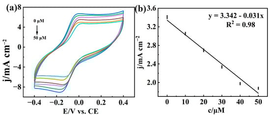 Finally, the current response of the AChE/COFDHNDA-BTH/portable paper-based electrode was measured with the accumulation of carbaryl concentration. Figure 6a shows the results of the peak current response increase with the increase in carbaryl concentration, and the linear range was 0.48~35 μM. Figure 6b shows the corresponding linear relationship between peak current density and carbaryl concentration. The linear equation was jp = –0.031c +3.342 (R2 = 0.98), where jp and c are peak current density and carbaryl concentration, respectively. The detection limit of the paper-based electrochemical biosensor was 0.16 μM (S/N = 3). The results showed that the AChE/COFDHNDA-BTH/portable paper-based electrode biosensor has good performance. In general, compared with the three-electrode system composed of glassy carbon electrodes, the experimental results of paper-based electrodes were similar, which proves that the preparation of paper-based electrodes was successful.