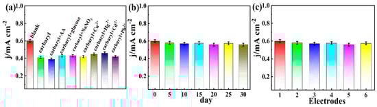 (a) Selectivity test of electrochemical carbaryl biosensor. (b) Current response histogram of electrochemical carbaryl biosensor measured for 30 consecutive days of carbaryl. (c) Current response histogram of six AChE/COFDHNDA-BTH/GCE to detect carbaryl.