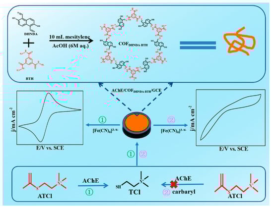 Firstly, the surface of GCE was polished with Al2O3 powder and washed with ethanol and ultra-pure water until the surface of GCE was smooth and clean. Then, 2 mg was dispersed into 1 mL of ultra-pure water to obtain 2 mg/mL of aqueous suspension. Next, 10 μL of 2 mg/mL COFDHNDA-BTH was dropped on the polished GCE surface. After 5 h, the COFDHNDA-BTH/GCE was rinsed with ultra-pure water. After that, 4 μL of 0.2 mg/mL AChE was dropped on the surface of the COFDHNDA-BTH/GCE. It was stored in a refrigerator at 4 °C. Finally, the electrode was rinsed with ultra-pure water to obtain AChE/COFDHNDA-BTH/GCE. The subsequent detection mechanism is shown in Scheme 1.