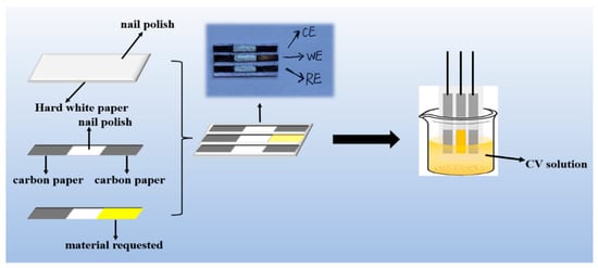To prepare a portable AChE biosensor, a portable paper-based electrode was constructed as follows: First, the commercial carbon paper was cut into three long strips 3 mm in width and 3 cm in length. Next, both sides of a piece of white cardboard, 2 cm in width and 3 cm in length, were painted with white nail polish. Next, the three long carbon paper strips were pasted onto one side of the white cardboard in intervals of about 0.5 cm. The middle sections of the long carbon paper strips (about one-third of the long strips) were painted with white nail polish. The bottom section of long carbon paper strips was peeled off with acrylic transparent tape to obtain a new surface with graphene-like foam as a working electrode (WE), reference electrode (RE), and counter electrode (CE). The active areas of WE, RE, and CE were all 1 × 3 mm. The prepared procedures and a picture of the obtained paper-based electrode are shown in Scheme 2.
