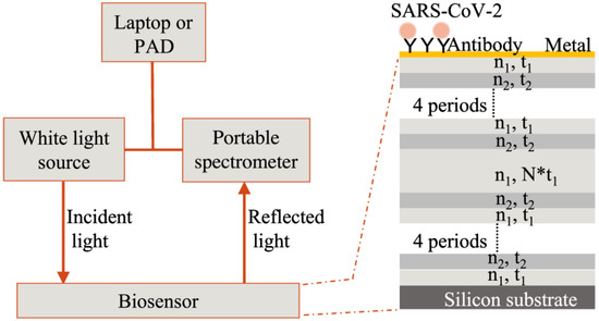 The detection of the biosensor is based on reflection spectroscopy. A portable and low-cost fiber spectrometer can be used to obtain the reflection spectrum of the biosensor. The biosensor surface has been coated by a specific antibody towards SARS-CoV-2. This latter is a pseudovirus prepared in artificial saliva that was used in this work. When the virus binds with the custom protein or antibody immobilized on the biosensor surface, the refractive index of the physical space occupied by the virus-antibody pair, which is also approximate to the biosensor surface, will increase. This will result in a redshift of the resonant-feature characteristics in the reflection spectrum of the biosensor. This resulting spectrum is measured twice before and after virus binding, and by calculating the amount of quantitative redshift information, the virus in the specimen can be obtained.