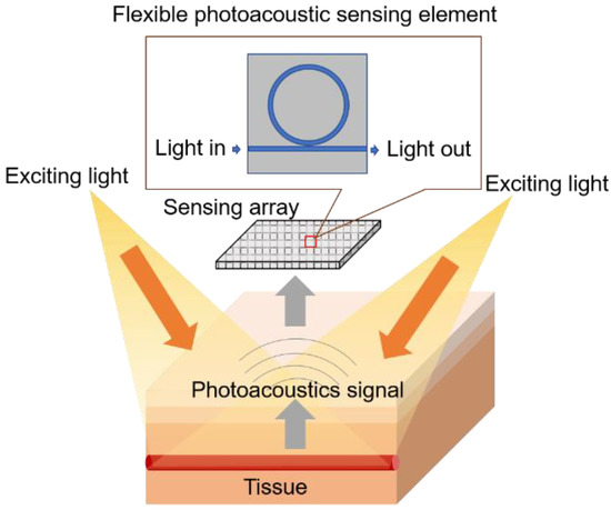 The ultrasound sensor is one of the most important parts of a PAI system. Traditional ultrasound transducers detect the photoacoustic signal by converting pressure signals to electrical signals. The transducers have narrow bandwidth and are limited for further miniaturization [14]. The systems need transducer arrays or a scanner to increase the field of view, which restricts the size of the probe and the precision of the detection. Some researchers use integrated photonics to detect photoacoustic signals with sensors of great performance [14,15]. Flexible devices will make transducers better in contact with human bodies, and they are one of the solutions for future wearable devices. Authors are integrating ultrasonic transducers on flexible substrates and using them for human body sensing [16,17]. Figure 3 shows the schematic of flexible electronic systems intended for application in photoacoustic sensing.