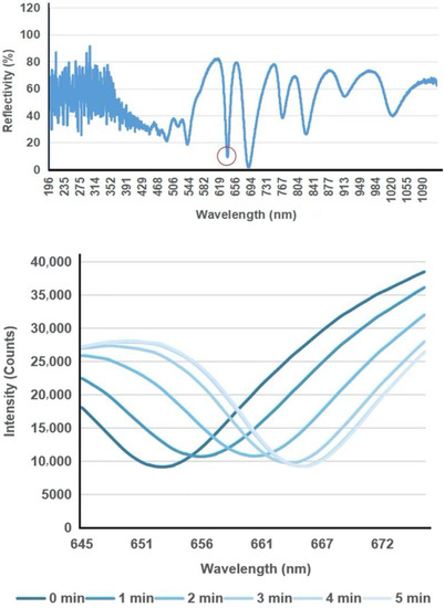 Figure 5. The biosensor’s response for detecting SARS-CoV-2 N protein (10 ng/μL). Above: characteristic valley of the reflection spectrum used for tracking the spectral shift is circled in red. Below: real-time shift of the characteristic valley as the N protein of SARS-CoV-2 is binding with the specific antibody.
