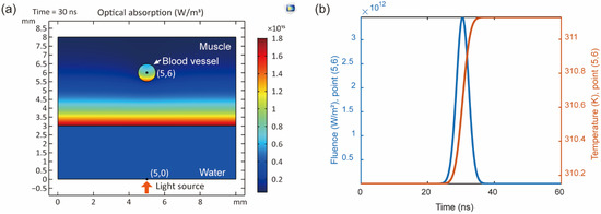 Our simulation method followed the previous work [25]. Figure 6 shows the preliminary simulation results of optical absorption distribution, optical fluence, and temperature changes inside the simplified lung tissue model, including the muscle and blood vessels. The Gaussian pulsed light was input as an excitation source into the tissues through the water layer from point (5, 0). The optical absorption distribution at 30 ns is shown in Figure 6a. The optical absorption decreased with the depth increasing. At the same horizontal level, the blood vessel absorbs more light energy than the surrounding tissue, which provides the means to detect the blood vessel inside the tissue. If the data at points (5, 6) is extracted, the optical fluence and temperature changes as functions of time are shown in Figure 6b. When the optical fluence has an envelope of Gaussian function, the temperature increase gradually accumulates to generate a photoacoustic signal in one excitation.