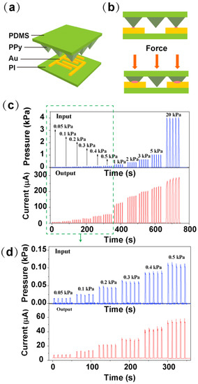 The electrical stimulation system includes a respiratory monitor unit and electrical stimulation unit. As shown in Figure 7a, the respiratory monitor device is based on a micro-pyramidal resistive force sensor, which is composed of a polyimide (PI) substrate integrated with interdigitated Au electrodes and polydimethylsiloxane (PDMS) film with micro-pyramidal structure conformally coated with polypyrrole (PPy). The mechanism of the sensor is depicted in Figure 7b. When the force is applied to the sensor, PPy-based micro-pyramidal film is deformed, which leads to the increased contact area between interdigitated electrodes and PPy film, and therefore the resistance decreases. Figure 7c,d illustrates the instant current-time curve of the respiration sensor under repeated loading/unloading of different forces between 0.05 kPa to 20 kPa, which includes human respiration level.
