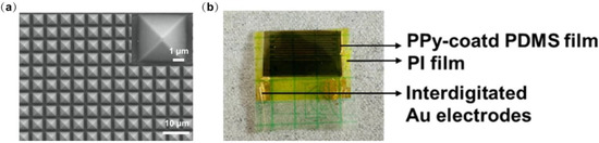 We conducted some characterization of the device. Figure 8a shows the SEM image of the micro-pyramidal PPy-based PDMS film. The optical image of the device layer is depicted in Figure 8b.
