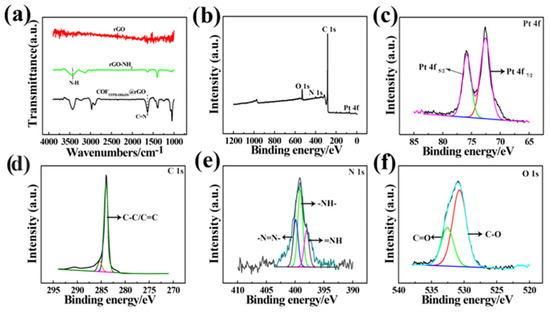 (a) FTIR spectra of rGO, rGO-NH2, and COFTFPB−DHzDS@rGO; (b) XPS spectrum of PtNP/COFTFPB−DHzDS@rGO; (c–f) fine XPS spectra of Pt 4f, C 1s, N 1s, and O 1s, respectively.