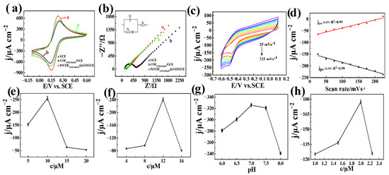 (a) CVs curves and (b) EIS diagram (inset is equivalent circuit diagram) of bare GCE (curve a), COFTFPB−DHzDS/GCE (curve b), and PtNP/COFTFPB−DHzDS@rGO/GCE (curve c) in 0.1 M KCl solution containing 5 mM [Fe (CN)6]3−/4−; (c) CVs of PtNP/COFTFPB−DHzDS@rGO/GCE at different scan rates (25 mV s−1 to 225 mV s−1) in 0.1 M N2-statured phosphate-buffered solution (pH = 7.0) with 10 μM furazolidone; (d) the corresponding fitting curves between current density and scan rates; (e) the plots of peak current density versus different concentrations of TFPB, (f) different concentrations of potassium chloroplatinate, (g) different pH levels, and (h) different concentrations of PtNP/COFTFPB−DHzDS@rGO.