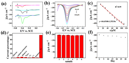 (a) DPV diagram of GCE (curves a and b), COFTFPB−DHzDS/GCE (curves c and d), and PtNP/COFTFPB−DHzDS@rGO/GCE (curves e and f) before (a,c,e) and after (b,d,f) the addition of furazolidone in N2-saturated 0.2 M phosphate-buffered solution (pH = 7); (b) DPV of PtNP/COFTFPB−DHzDS@rGO/GCE in N2-saturated 0.2 M phosphate-buffered solution (pH = 7) in the presence of furazolidone with different concentration; (c) the linear curve of the corresponding peak current density and concentration; (d) histogram of PtNP/COFTFPB−DHzDS@rGO/GCE for different interfering substances (glucose, sodium carbonate, thiourea, NaCl, UA, DA, mannose); (e) current responses of six different PtNP/COFTFPB−DHzDS@rGO/GCE to 100 μM furazolidone; (f) current responses of PtNP/COFTFPB−DHzDS@rGO/GCE to 100 μM furazolidone after different days.