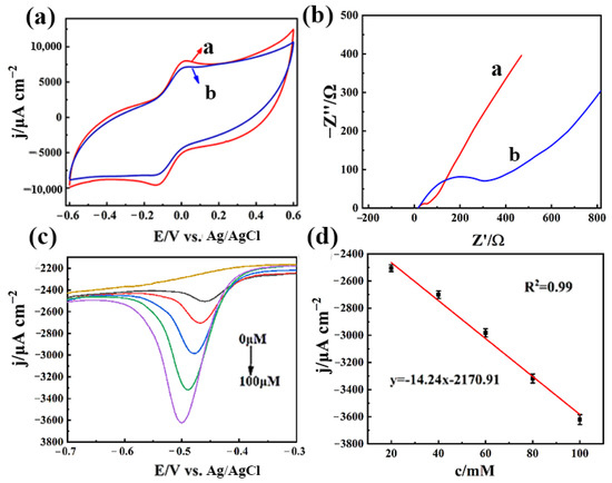 (a) CVs curves and (b) EIS diagram of ePAD (curve a) and PtNP/COFTFPB−DHzDS@rGO/ePAD (curve b) in 0.1 M KCl solution containing 5 mM [Fe (CN)6]3−/4−; (c) DPV of furazolidone with different concentrations detected by PtNP/COF TFPB−DHzDS@rGO/ePAD; (d) linear curves corresponding to peak current density and concentration of PtNP/COFTFPB−DHzDs@rGO/ePAD.