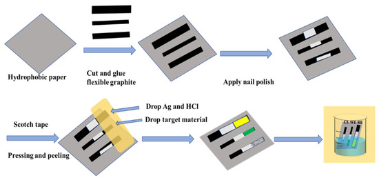 First, the commercial carbon paper was cut into long strips of 3 mm in width and 3 cm in length by using a regular paper knife. Then, two sides of a white cardboard sheet 2 cm in width and 3 cm in length were painted with white nail polish. Next, three long carbon paper strips were pasted onto a side of the white cardboard with an interval of about 0.5 cm. The middle sections of the long carbon paper strips (about one-third of the long strips) were painted with white nail polish. The bottom sections of the long carbon paper strips were peeled off using acrylic transparent tape to obtain a new surface with graphite-like foam as electrodes (working electrode, reference electrode, and counter electrode). Then, the reference electrode was coated with a layer of conductive silver powder, and HCl was added dropwise to form AgCl/Ag. (Scheme 2).