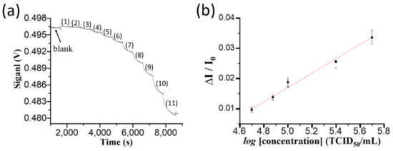 (a) The sensorgram obtained by sequentially injecting NNV standard solutions at concentration of (1) 1.0 × 103, (2) 2.5 × 103, (3) 5.0 × 103, (4) 7.5 × 103, (5) 1.0 × 104, (6) 2.5 × 104, (7) 5.0 × 104, (8) 7.5 × 104, (9) 1.0 × 105, (10) 2.5 × 105, and (11) 5.0 × 105 TCID50/mL. (b) The standard calibration curve of the normalized response (ΔI/I0) versus the logarithm value of NNV concentration (log[C]). Each point is the mean of 3 repeated measurements.