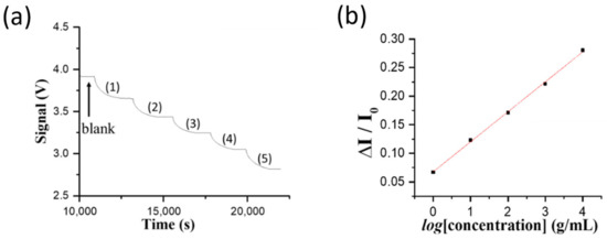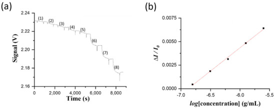 (a) The sensorgram obtained by sequentially injecting NNV coat protein standard solutions at concentrations of (1) 1.4 × 10−7, (2) 2.8 × 10−7, (3) 5.6 × 10−7, (4) 1.25 × 10−6, (5) 2.5 × 10−6, (6) 5.0 × 10−6, (7) 1.0 × 10−5, and (8) 2.0 × 10−5 to g/mL. (b) The corresponding standard calibration curve of the normalized response (ΔI/I0) versus the logarithm value of NNV coat protein concentration (log[C]), over the range of 1.4 × 10−7 to 2.5 × 10−6 g/mL.
