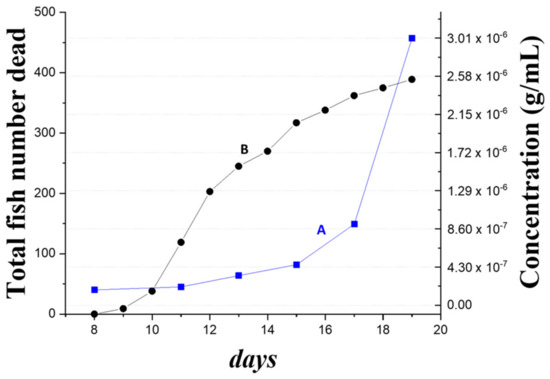 The detected concentration of NNV coat proteins in an infected pond using FOPPR biosensor (curve A) from the eighth day to the nineteenth day during a larvae cultivation process; the death toll of grouper larvae (curve B) in the same time span.