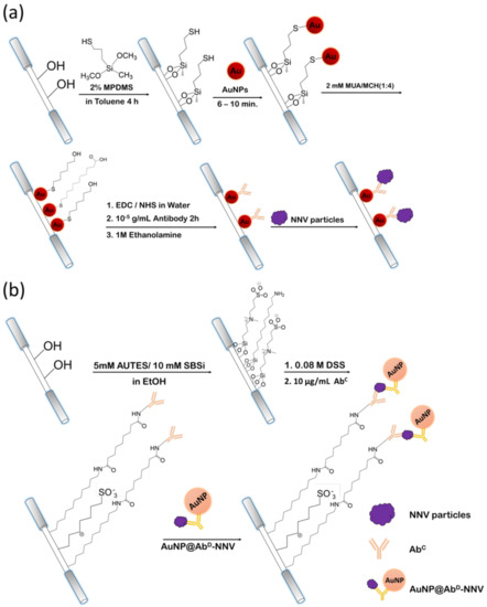 Scheme 1b shows a schematic illustration of the FONLISA method of FOPPR biosensor for detection of NNV. A partially unclad optical fiber was first modified with a mSAM by immersion in an ethanol solution of AUTES and SBSi, where AUTES provides an amine (−NH2) end group for bioconjugation of anti-NNV antibodies as a capture probe (AbC), and SBSi provides a zwitterionic terminal end to resist nonspecific adsorption of matrix molecules and AuNP@AbD conjugation on the fiber core surface [21,26]. In the presence of an analyte (A), in this case NNV, the immobilized capture antibodies (AbC) on the fiber core surface and the free AuNP@AbD conjugate will interact with NNV to form a sandwich-like AuNP@AbD–A–AbC complex on the fiber core surface.