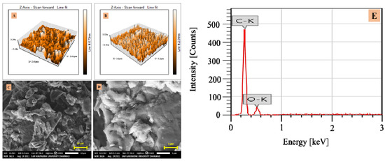 AFM is a beneficial device for studying the surface morphology of the material at the nano to microscale. The modifier’s average surface roughness (Ra) was determined by AFM analysis [30] and the obtained AFM images are depicted in Figure 1A,B. The Ra of CPE and G-CPE were found to be 0.4 and 1.0 pm2, respectively, indicating the enhancement in the surface roughness of the developed electrode material. The SEM of the glucose intercalated carbon matrix (Figure 1C,D) showed an exfoliated and layered structure, which might have been due to the modifier’s uniform dispersion, which led to the increased surface area. The SEM of CPE displayed the homogenous and uniform shape graphite matrix. The SEM image of CPE and SEM-EDS image of CPE are depicted in Figure S1A,B, respectively. Figure S1C displays the EDS image of CPE where we can notice the presence of only one peak for carbon, implying high purity of graphite. The elemental composition of the graphite matrix and modifier was analyzed using energy dispersive X-ray spectroscopy, shown in Figure 1E. The peaks were observed for C and O with the weight percent of 74.46 ± 0.59 (atom%—79.53 ± 0.63) and 25.54 ± 1.28 (atom%—20.47 ± 1.02), respectively.