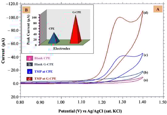 (A) Cyclic voltammograms of (a) blank CPE, (b) blank G-CPE for buffer solution, (c) nascent CPE, and (d) G-CPE for 0.5 mM TMP solution, (B) Peak current responses at fabricated electrodes.