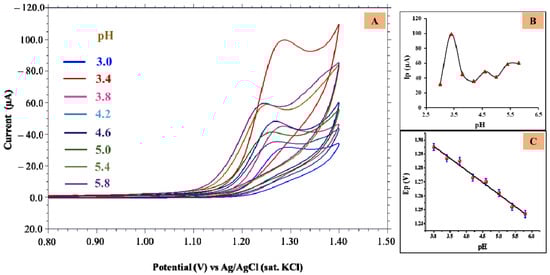 The electrochemical behavior of 0.5 mM TMP was examined at various pH levels using cyclic voltammetry in the presence of electrolyte solution with a pH ranging from 3.0 to 5.8 at G-CPE. The recorded voltammograms are depicted in Figure 3A. No oxidation peak was detected for the TMP in and above pH 6.0, suggesting the efficient oxidation of the TMP in the acidic medium for the developed electrode system. The intensified peak was obtained for pH 3.4 (Figure 3B); hence, it was an appropriate buffer for further investigations. From Figure 3C, it is evident that the peak potential (Ep) value was shifting toward a negative potential value with increased pH verifying the transfer of H+ ions in the reaction mechanism [32]. The linear equation can be expressed as: Ep = −0.0174 pH + 1.35; R2 = 0.987. From the above equation, the slope value was closer to 0.021 V/pH, implying the involvement of unequal protons and electrons in the process [33].