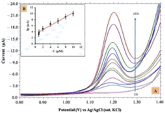 (A) Differential pulse voltammograms obtained for various TMP concentrations from 0.9 µM–100 µM (1–13); (B) Dependence of Ip vs. concentration.