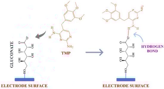 The working electrode was enriched with a glucose having a hydroxyl group and formed gluconate [26], which conjugated with the analyte through electrostatic force of attraction, which resulted in the formation of the intramolecular hydrogen bond. This interaction was sufficient to hold the TMP in the sensor’s vicinity, as shown in Scheme 1. This temporary coupling of the analyte molecule and the modifier matrix facilitated the electrooxidation reaction mechanism.