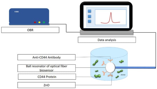 In this work, a ball resonator optical fiber sensor that worked as an ultra-weak interferometer was fabricated on a standard single-mode fiber (SMF-28) using a splicing machine (Fujikura LZM-100) that uses a CO2 laser as a localized heater. The splicing machine reduces the fabrication cost of the optical fiber sensor and increases its repeatability. To fabricate the ball resonator optical fiber, two SMF-28 fibers were aligned in the x-axis under the CO2 laser, spliced, and a high power was applied to the optical fiber to fabricate the ball structure at the tip by axis turning, and pulling in opposite directions. As a result, a spherical tip was formed at the end of the fiber, which was subjected to a break near to the splicing point [38]. The described device worked as an interferometric fiber-optic sensor. During operation, part of the optical signal propagating along the fiber is reflected at the boundary between the core and shell of the microsphere, while the rest is transmitted and is reflected from the surface of the microsphere according to the scheme presented in [38]. These two beams interfere with each other, the reflection from the surface of the microsphere depends directly on the optical properties of the deposited ZnO coating. The thus-obtained spectrum is interrogated using the OBR; this instrument is needed in order to detect low spectral fringes obtained through the weak interfering pattern in the spherical fiber tip. The experimental setup for the detection of the CD44 protein was carried out on an optical backscatter reflectometer (Figure 1). The 557–551 µm optical fiber is found for CD44 protein detection, while the 514–519 µm and 525–521 µm optical fibers are used for prostate-specific antigen (PSA) protein measurement control and CD44 protein negative control measurement, respectively. The values of absolute and relative power, rotation speed and feeding speed to obtain the spherical tip sensors of diameters 557–551 µm, 525–521 µm, 514–519 µm are shown in Table S1 [39].