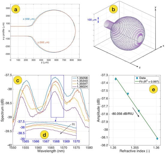 Design and calibration of the ball resonator biosensor: (a) two-sided profilometry of the ball resonator, measured through the CO2 laser splicer; (b) 3D mesh of the ball resonator, highlighting the longitudinal cross-sections (grey) and azimuthal planes (purple); (c) S-polarization spectrum of the bare ball resonator sensor, measured for different RI values ranging from 1.351 to 1.360; (d) the inset shows the spectral feature around 1567 nm used for spectral tracking of the intensity; (e) RI calibration, showing the change of intensity as a function of the RI change and sensitivity estimation (−80.056 dB/RIU).
